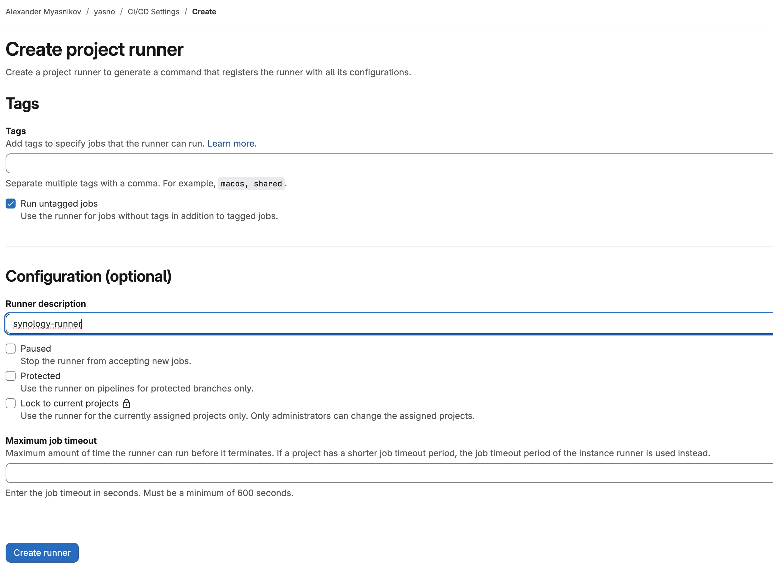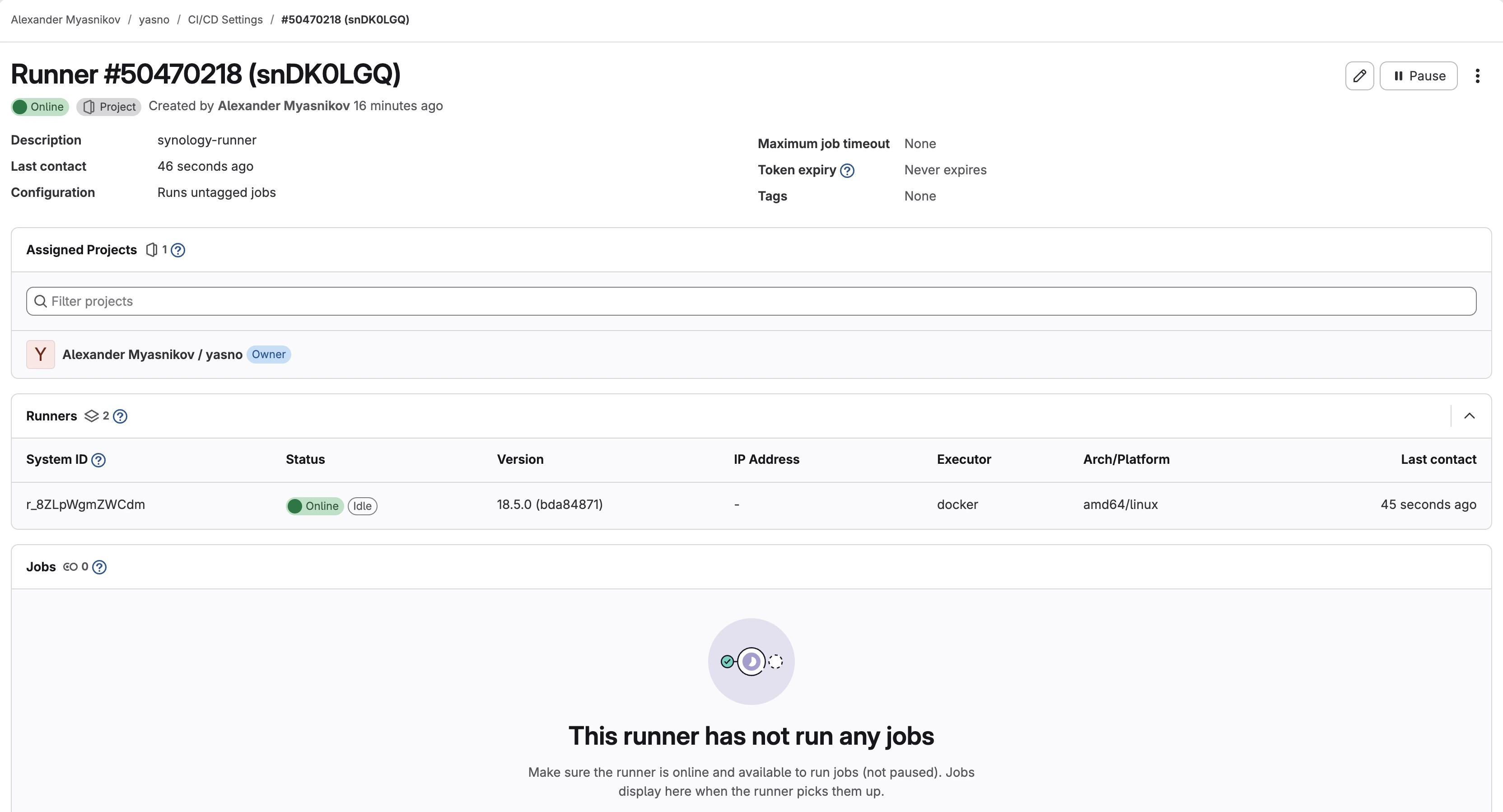 Такой подход имеет несколько преимуществ: NAS работает круглосуточно, поэтому Runner всегда доступен; вы не расходуете минуты бесплатного плана GitLab; а выполнение задач происходит прямо в вашей локальной сети, что повышает скорость и контроль.