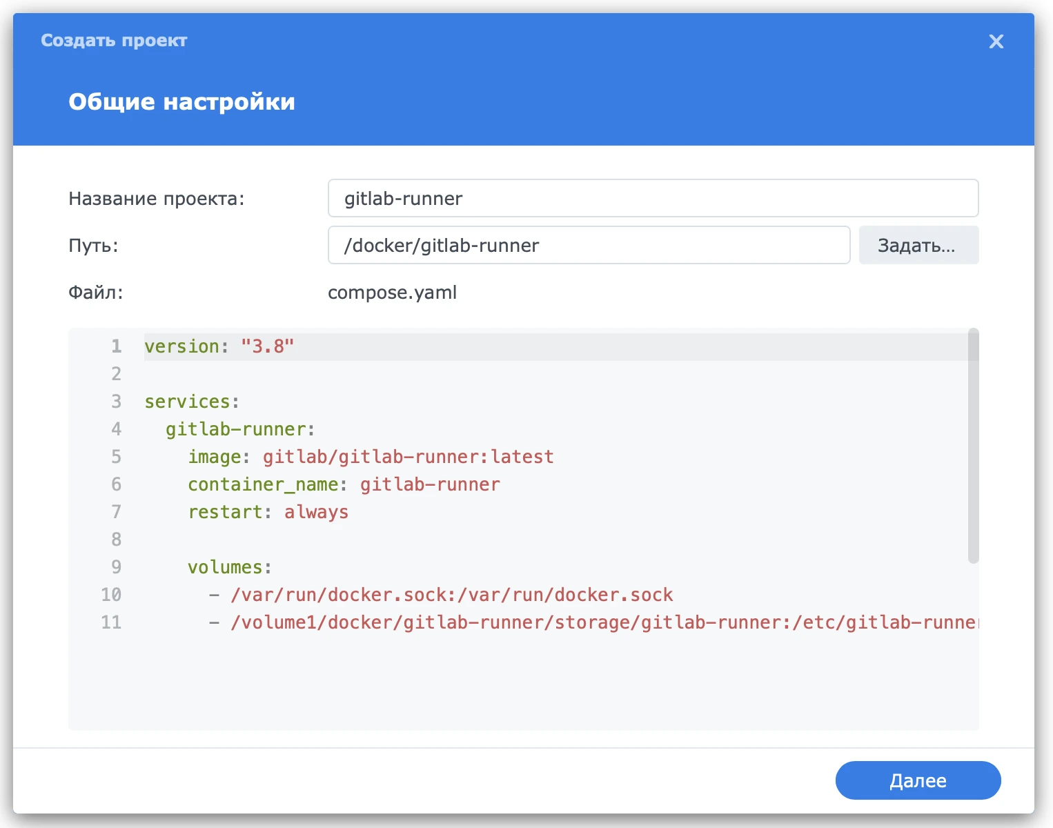 Теперь нужно зайти в NAS и создать проект на основе docker-compose конфигурации: